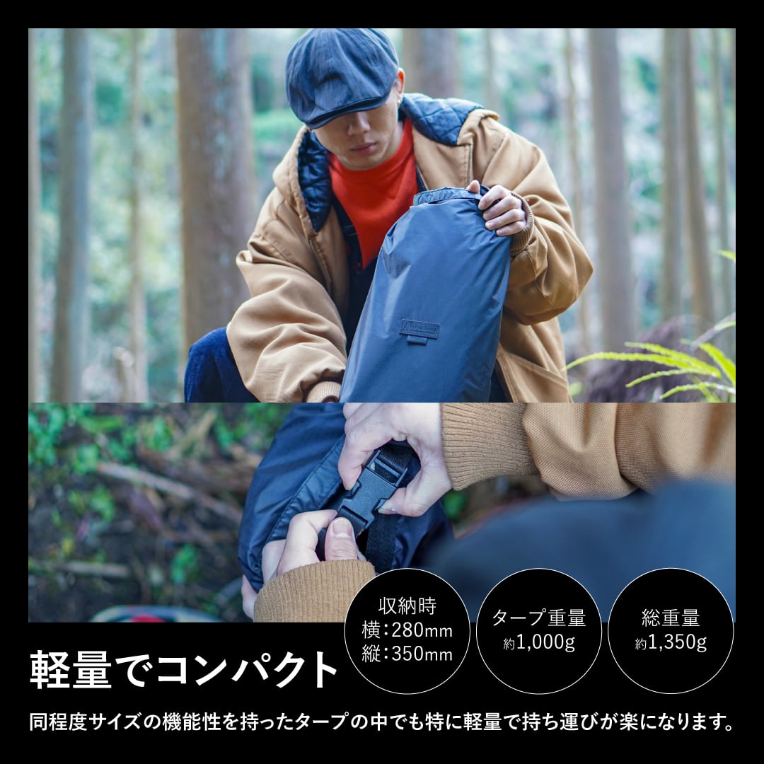 タープ本体重量は約1000gと軽量で、収納サイズは280×350mm。バックパックに入れられて、持ち運びに便利。
