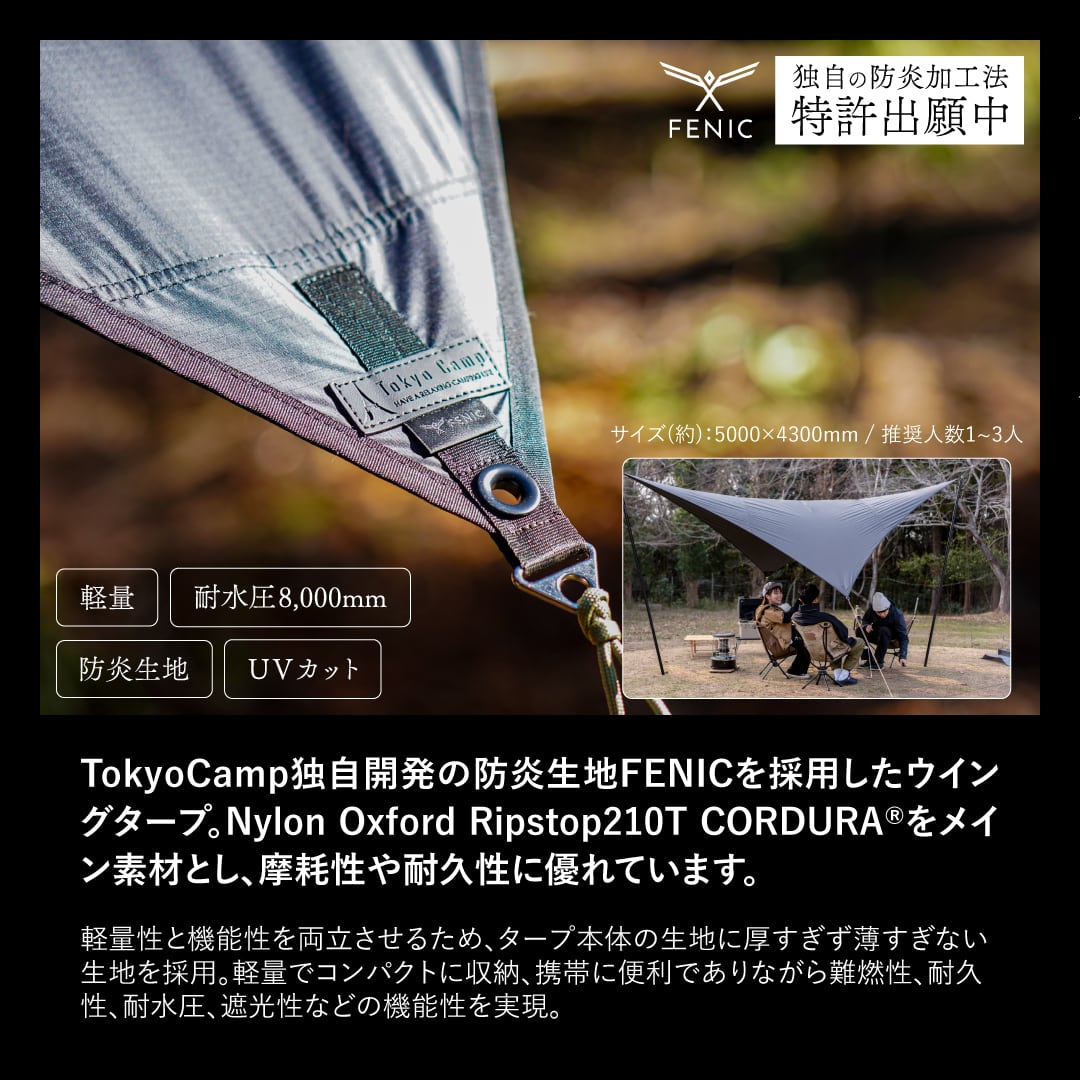 FENICはTokyoCampが開発した防炎加工済みの生地です。難燃性、防水性、撥水性、UVカットに優れ、焚き火の安全性を強化します。JIS L 1091防炎テスト合格。