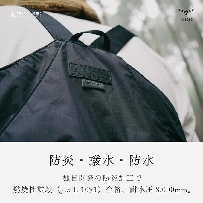 【新防炎生地FENIC】 FENICとはTokyoCampが独自の防炎加工を施した生地。難燃性・防水性・撥水性・UVカットに優れた多機能生地。焚き火台を扱うブランドだからこそ、炎による事故を減らすために開発。万が一火の粉がベストについても、燃えにくい。JIS L 1091防炎テスト合格。耐水圧8,000mm。※※防炎加工を施しておりますが、不燃素材ではありません。火の粉や直火にあたることによって、焦げたり、溶けて穴が空いてしまう恐れがあります。十分に注意してご使用ください。