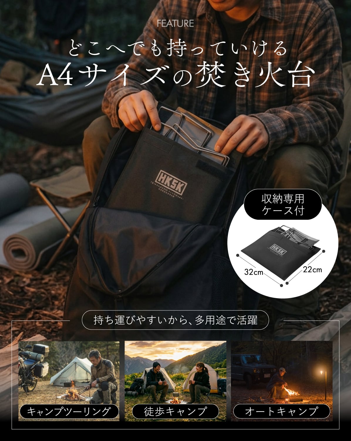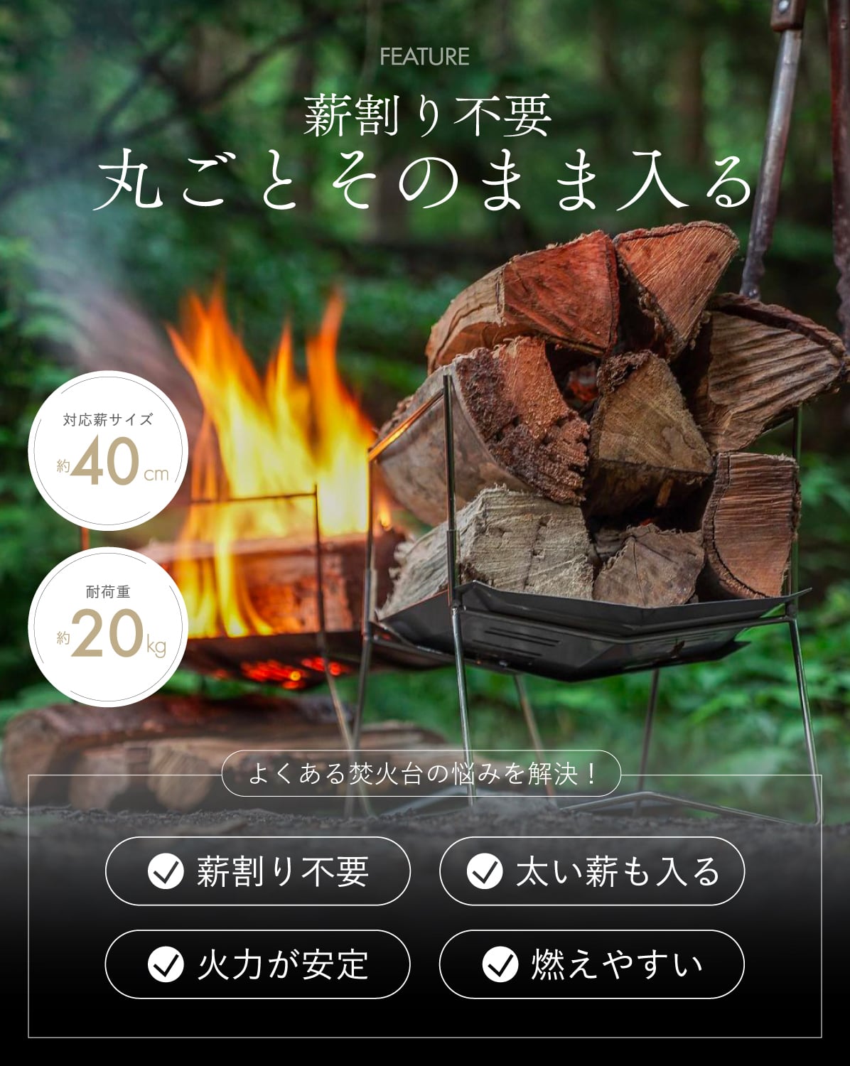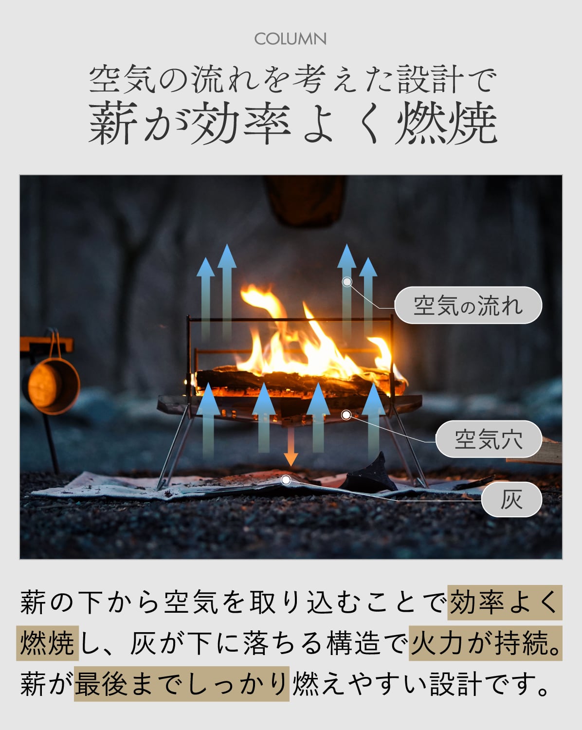 【工具不要・組立15秒で初心者も安心】直感的に組み立てられる構造で、設営はわずか15秒。誰でも簡単に焚き火を楽しめるユーザーフレンドリー設計。
