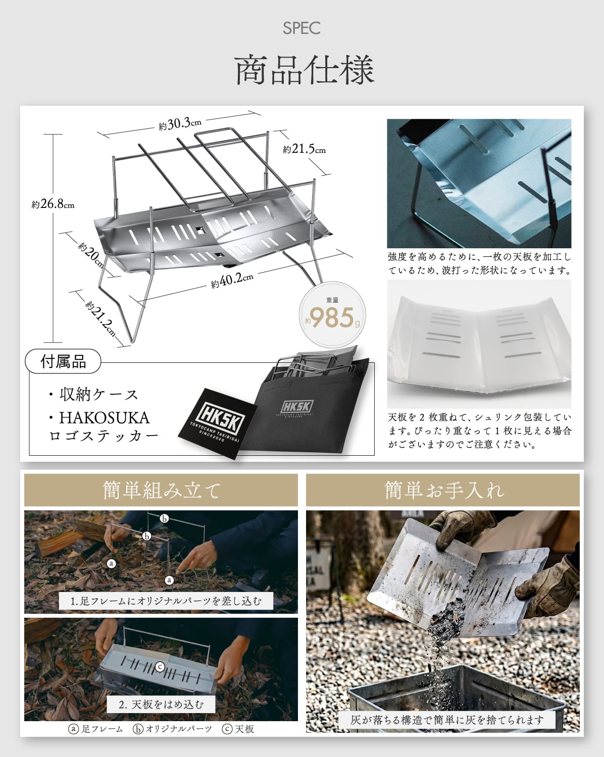 TokyoCamp 焚き火台 HAKOSUKA は、**名車「Nissan Skyline 2000GT-R(通称:ハコスカ)」の無骨な構造美と走りの哲学を継承。**直線的で研ぎ澄まされたフォルムは、機能性と美しさを両立。使うほどに信頼が増す“語れる焚き火台”として、50年後にも語られる存在を目指しています。